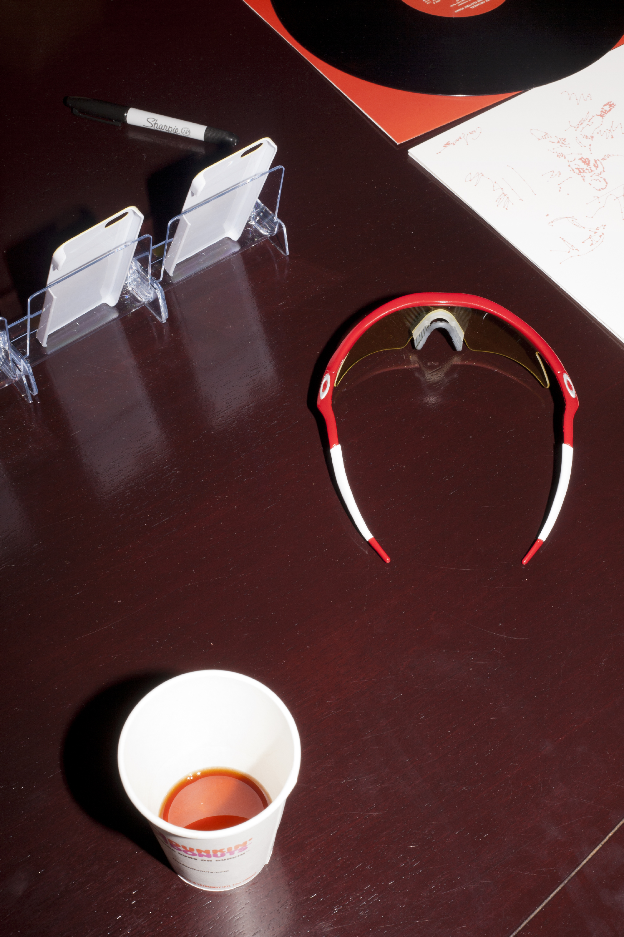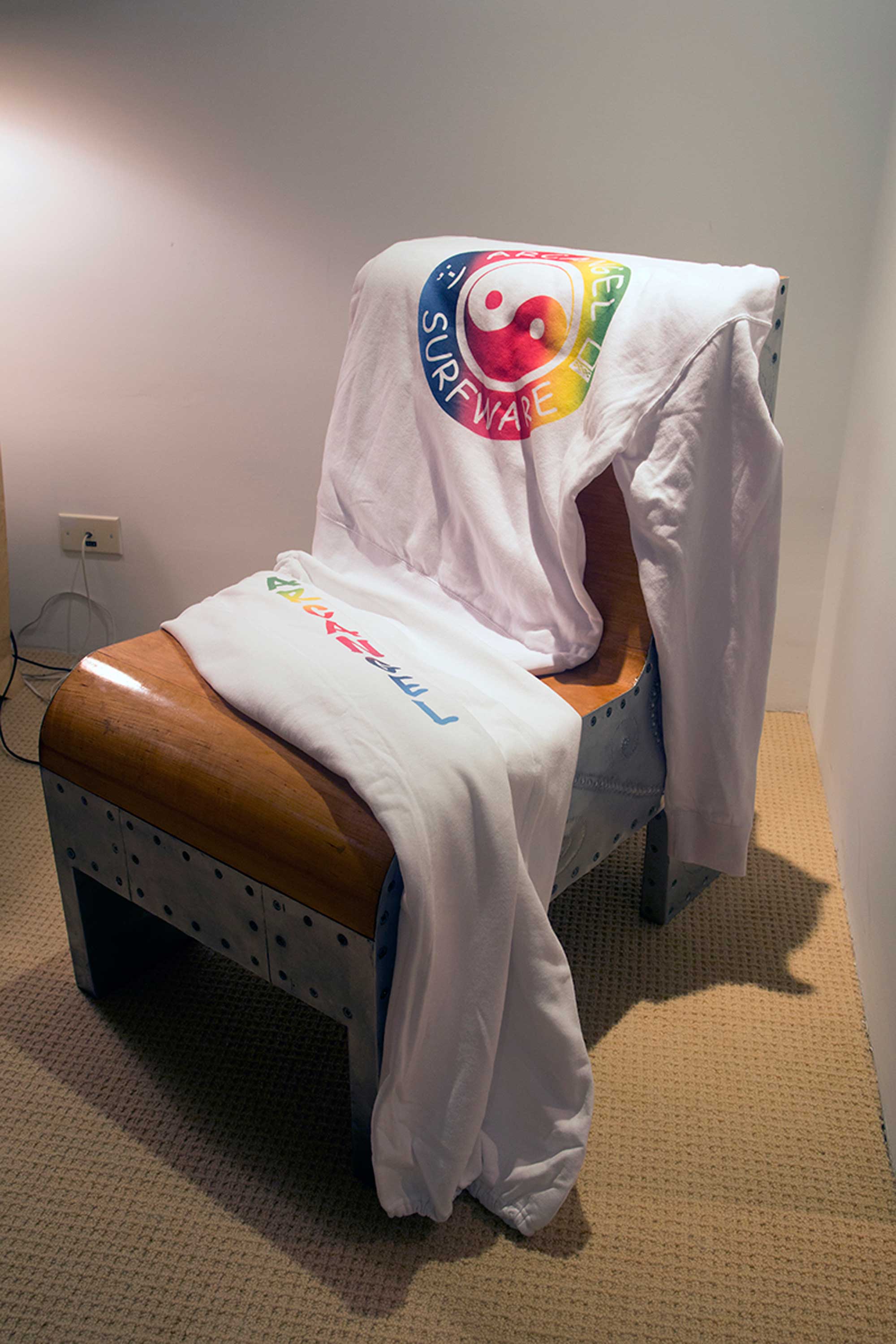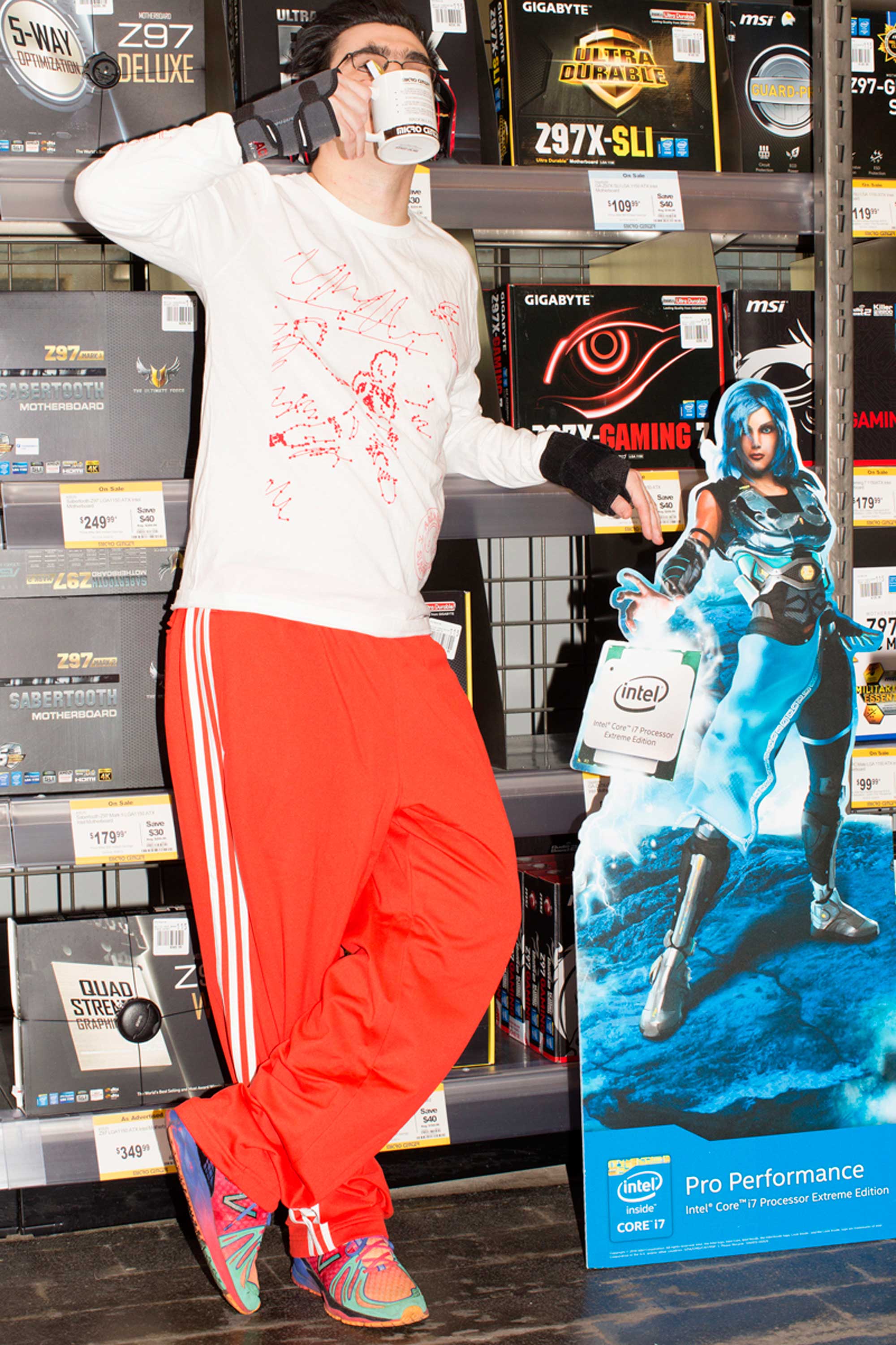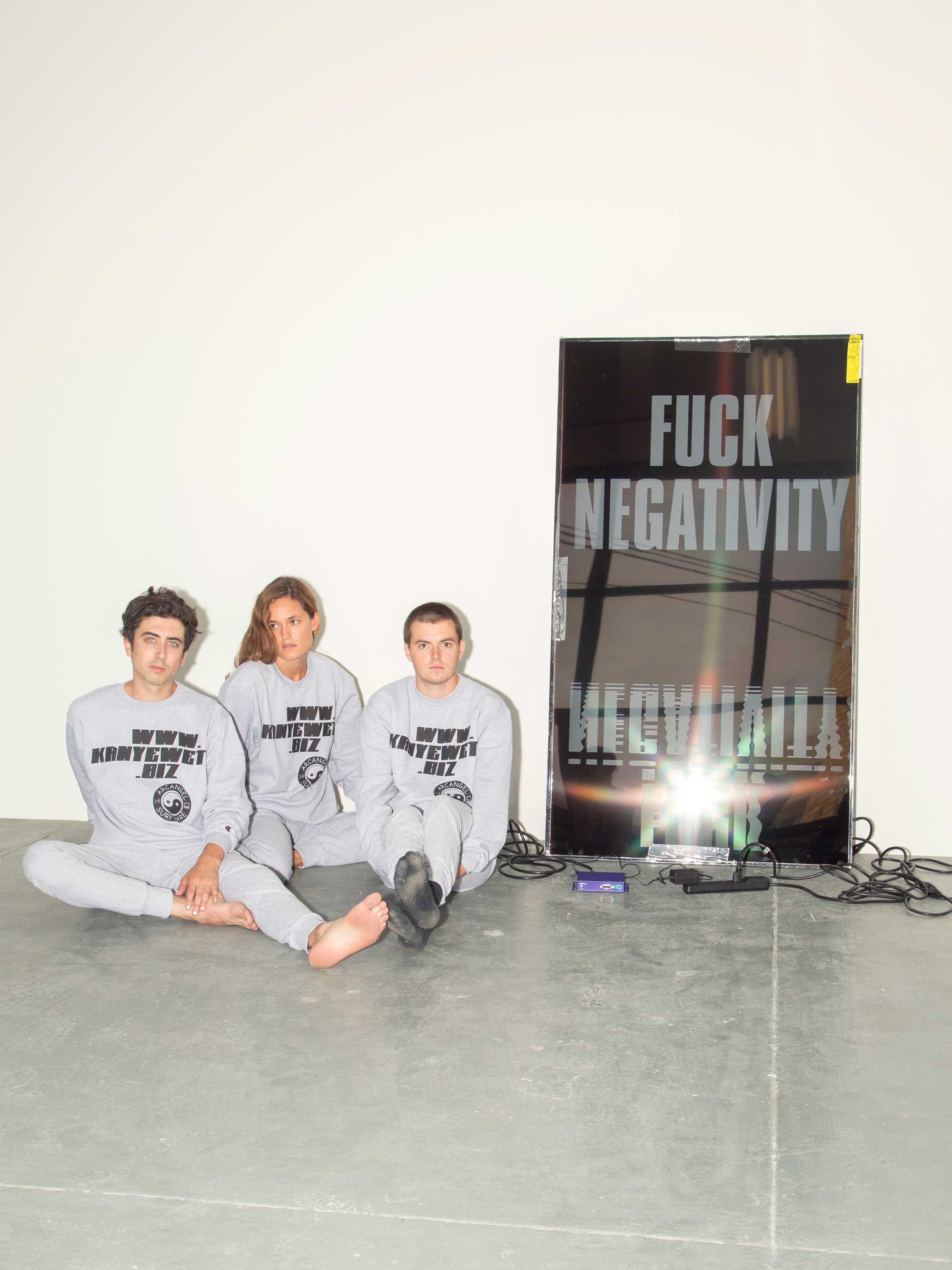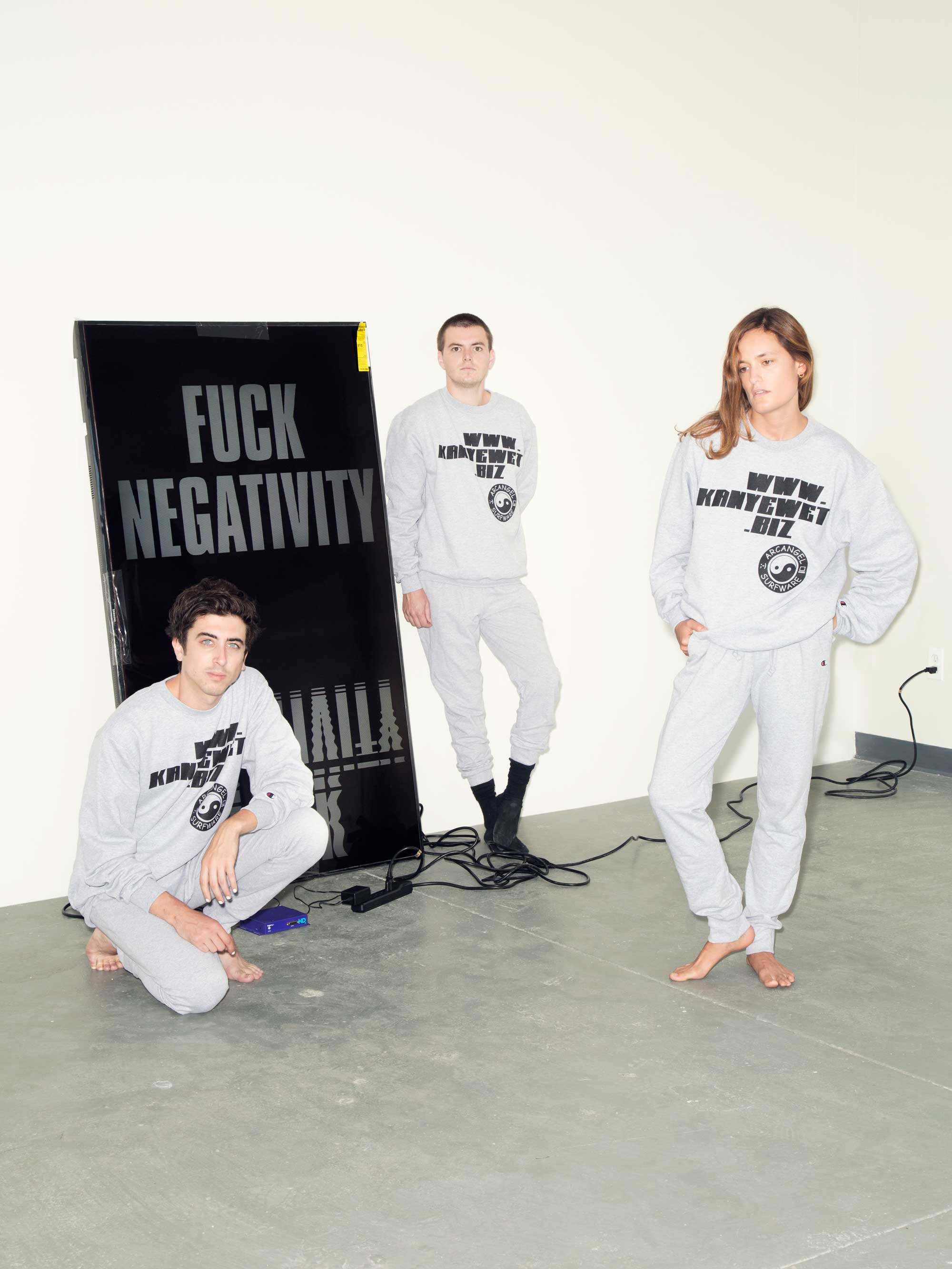 Designed by Cory Arcangel in partnership with Bravado, the global music merchandising company, the Arcangel Surfware 2015 “Fuck Negativity” collection consists of dog tags, a limited edition trench coat, lighters, “brah” style sliders, and – what are now considered the brand’s trademarks – loose fitting sweats and hoodies.