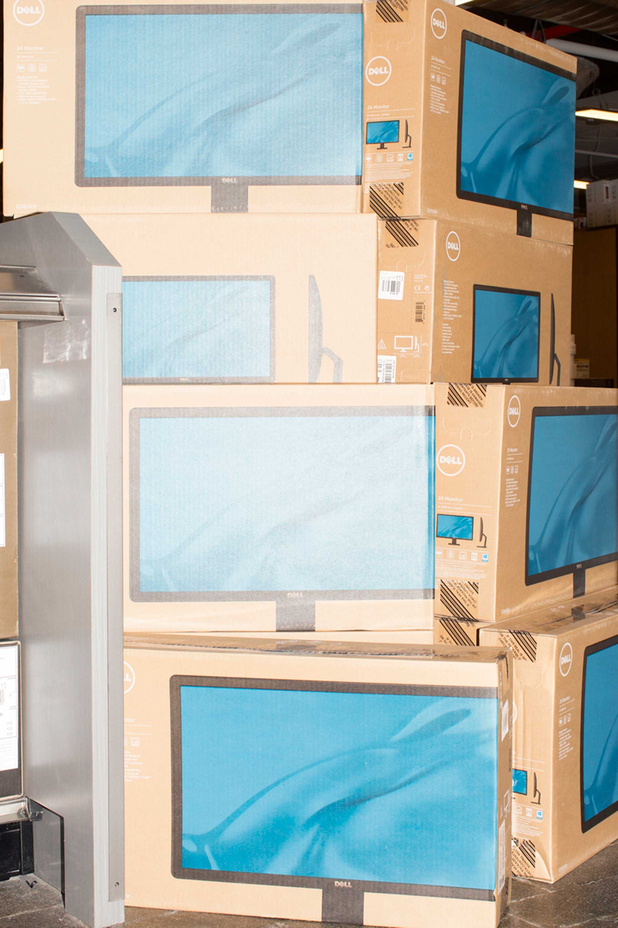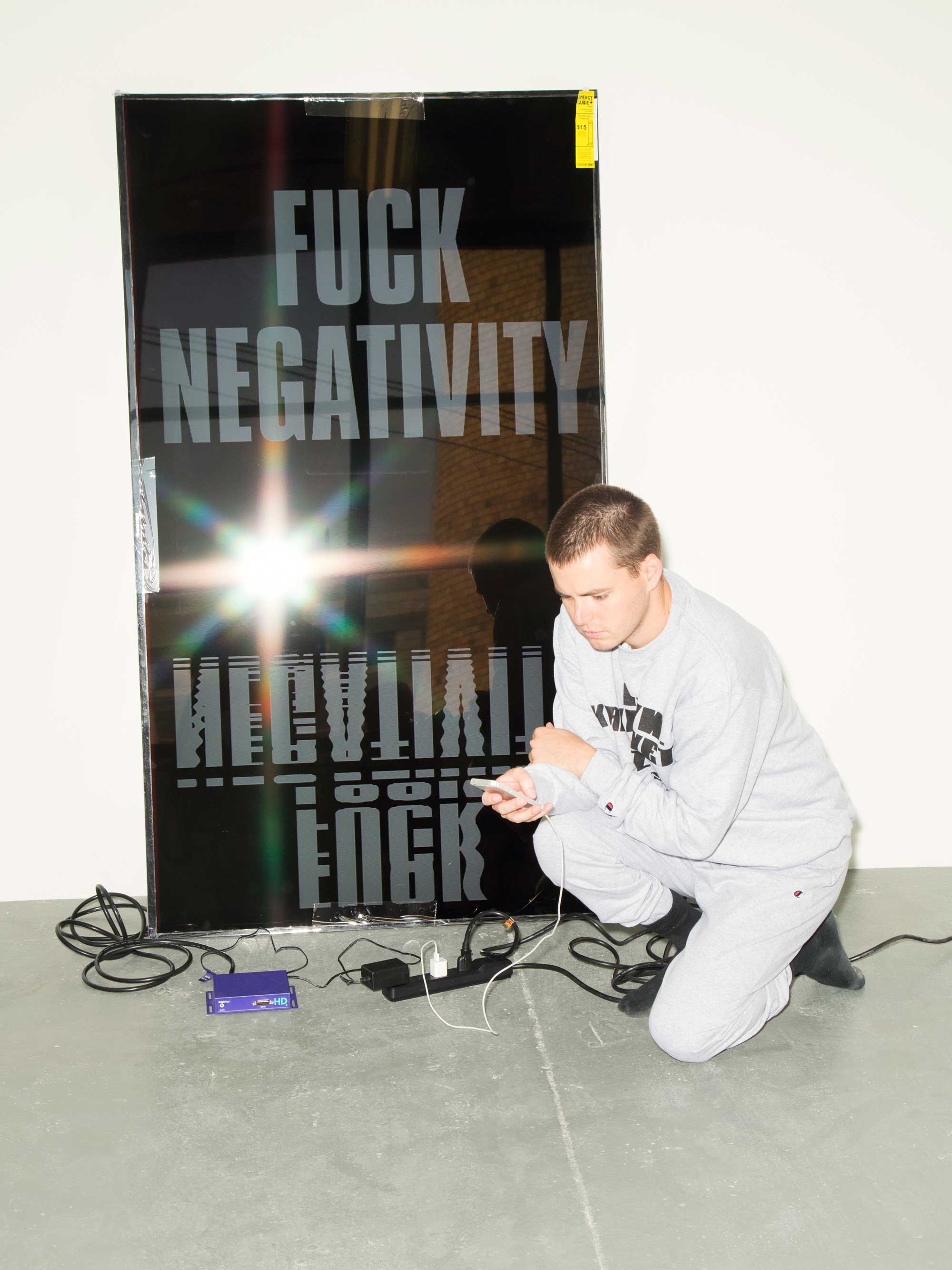 All items are inspired by Arcangel’s iconic 2014 sculptural work, Going Negative / Lakes. The work – part of the artist’s “Lakes” series – is a sculpture consisting of a flat-screen television turned on its side displaying the phrase “FUCK NEGATIVITY”. The phrase has been mirrored by the Java applet “lake,” which creates a shimmering, seemingly liquid reflection along a horizontal axis.